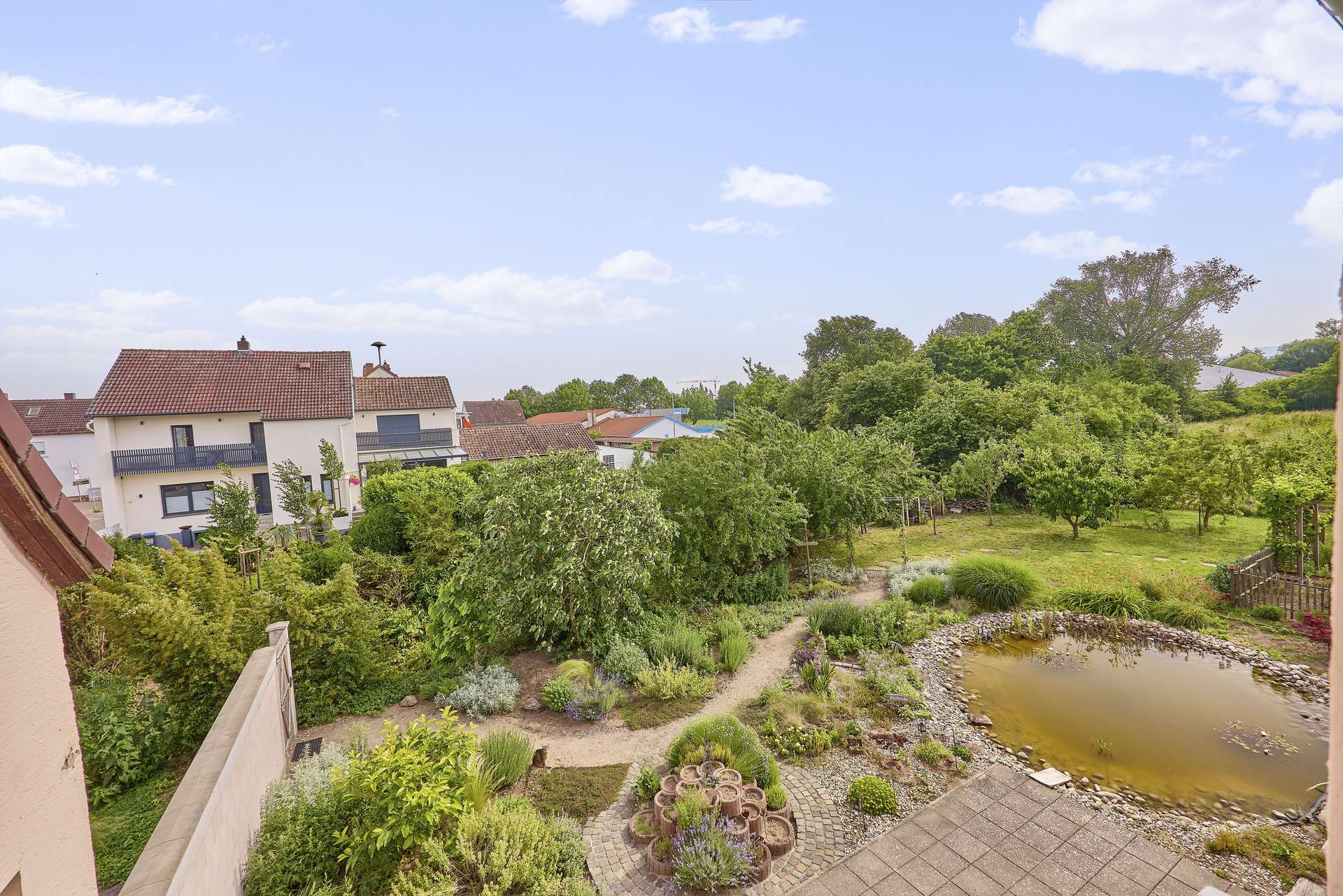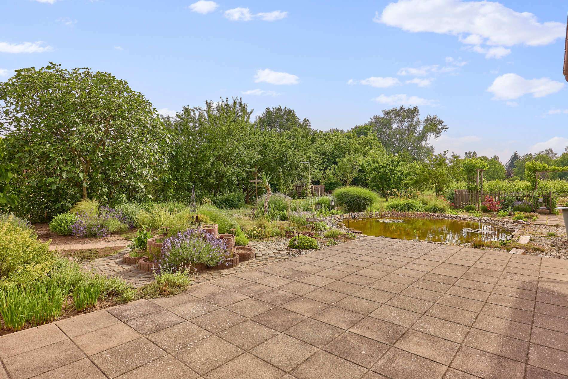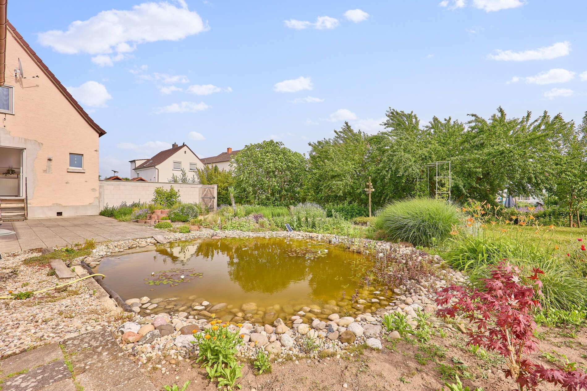 ✓ wunderschöner Garten mit großzügiger Terrasse, Teich und Blick auf die