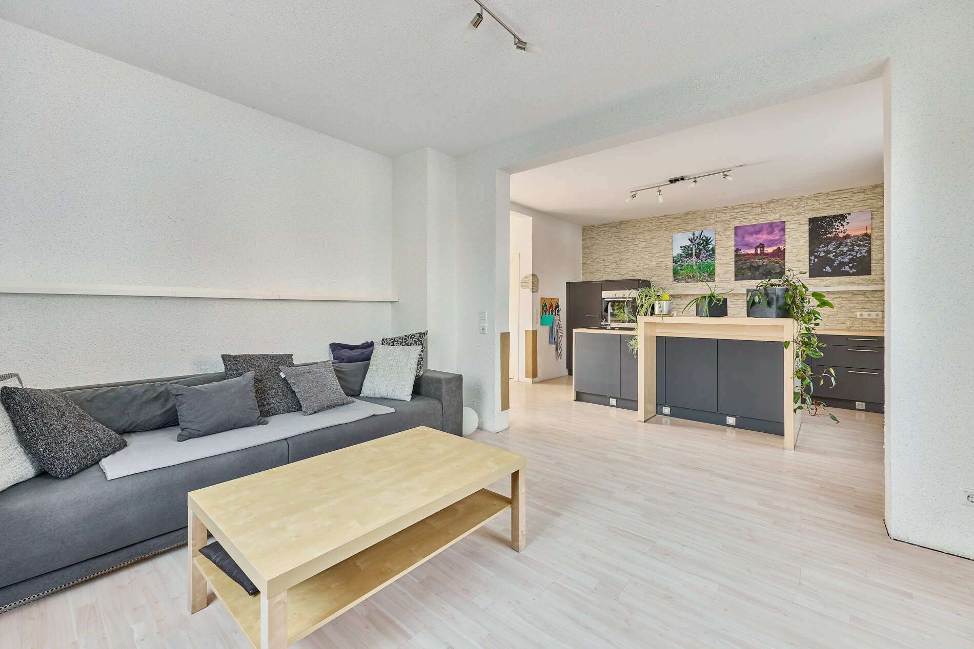 ✓ helles Wohnzimmer mit hochwertiger Wohnküche der Firma Schüller