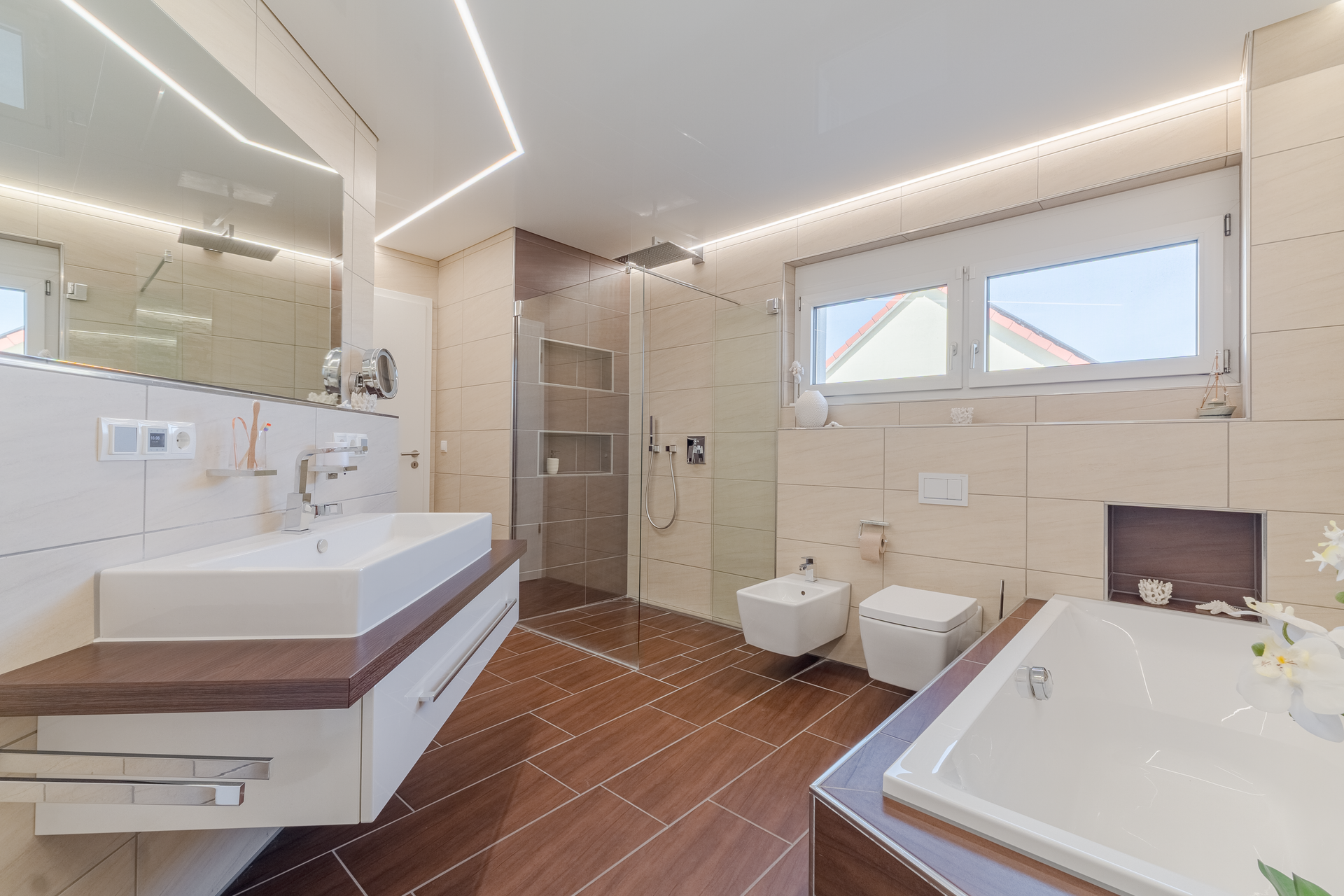 ✓ Wellness-Bad mit bodengleicher Dusche, Badewanne & Naturstein-Akzenten