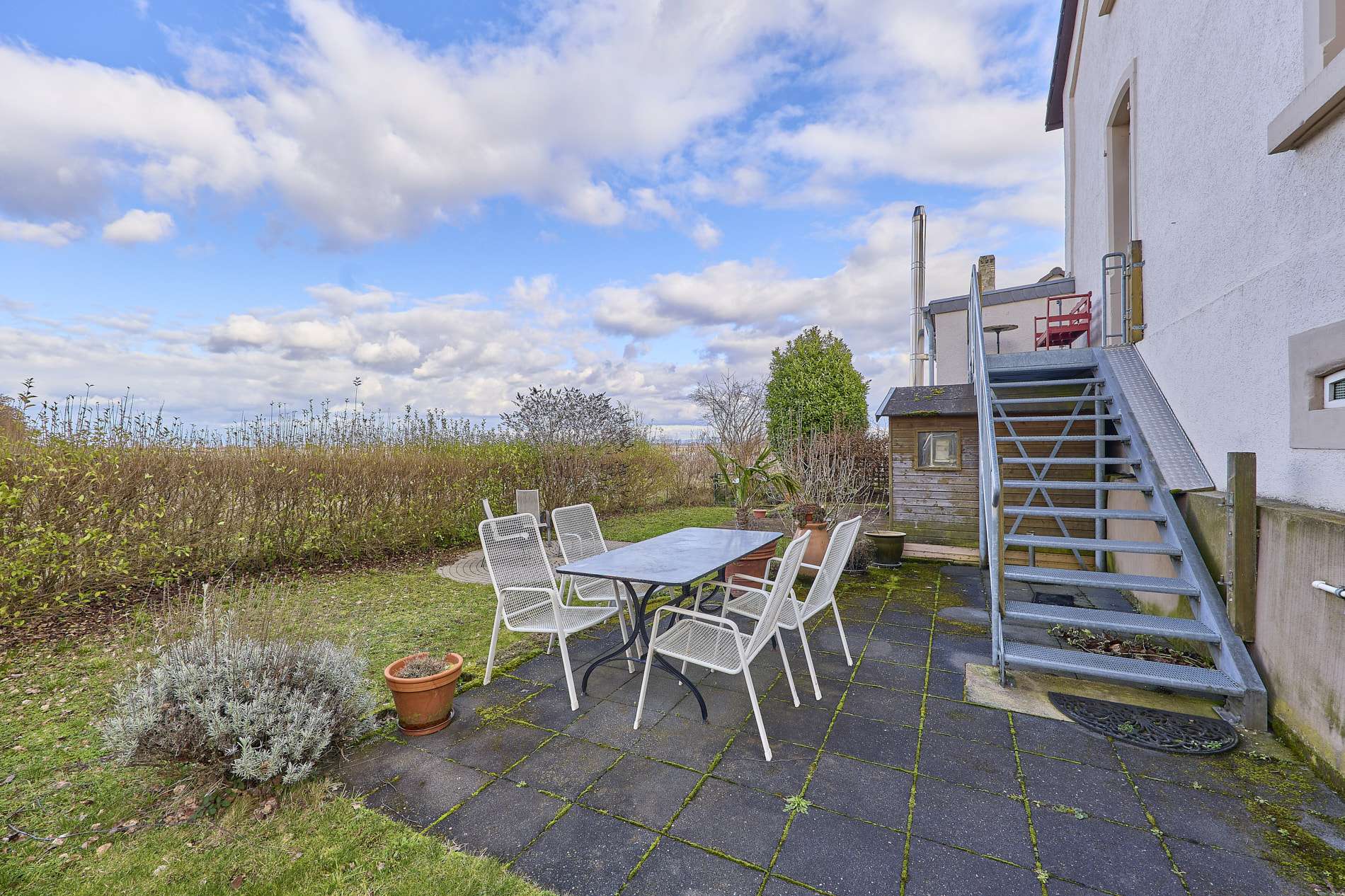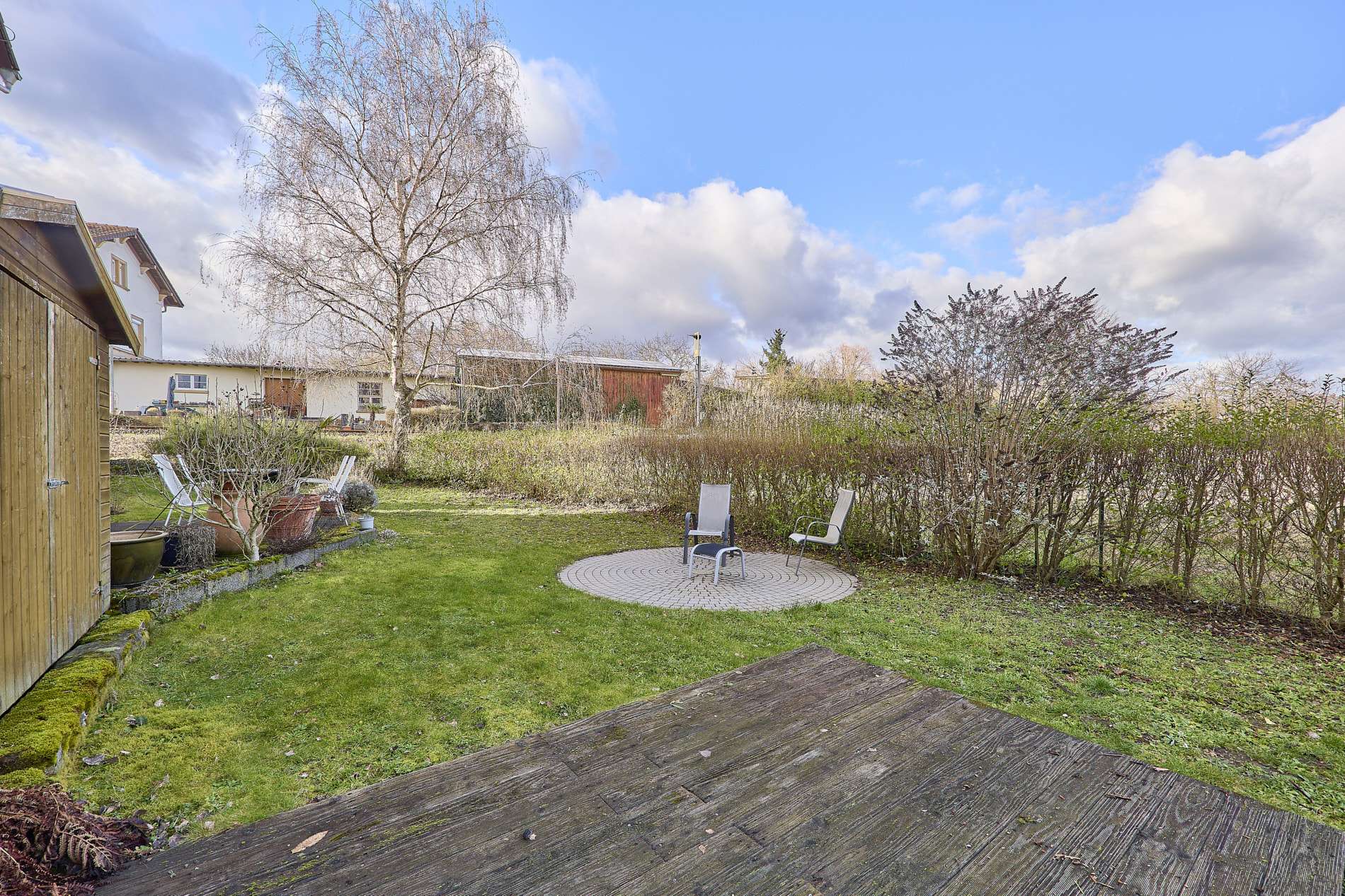 ✓ sonniger Gartenbereich mit Terrasse und vielfältigen Nutzungsmöglichkeiten