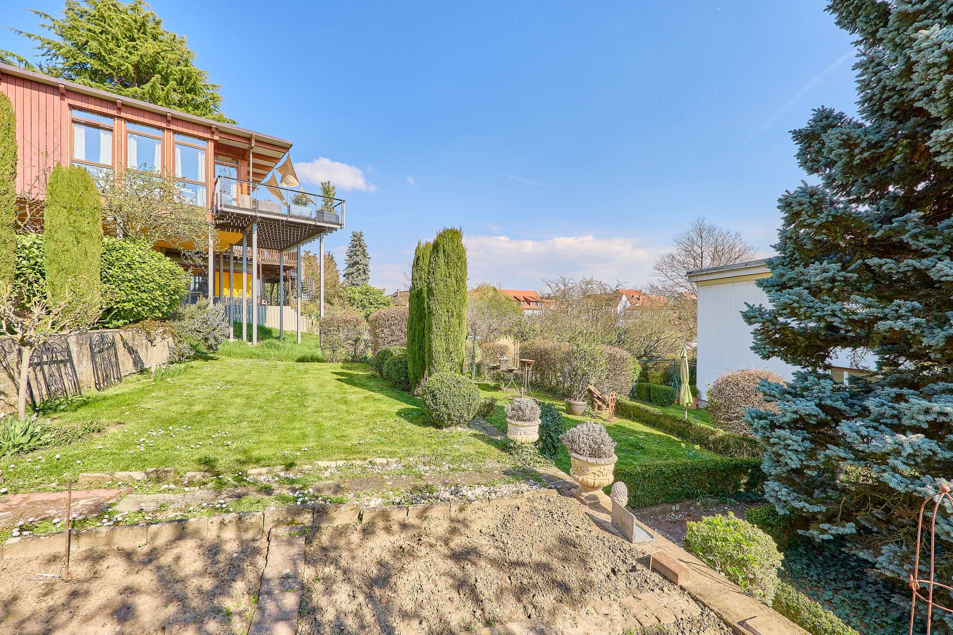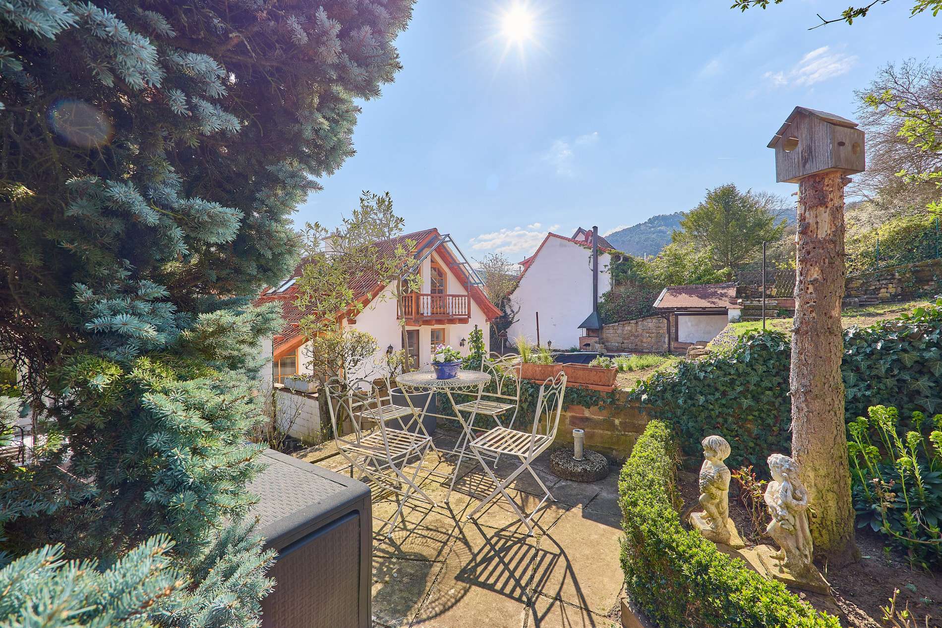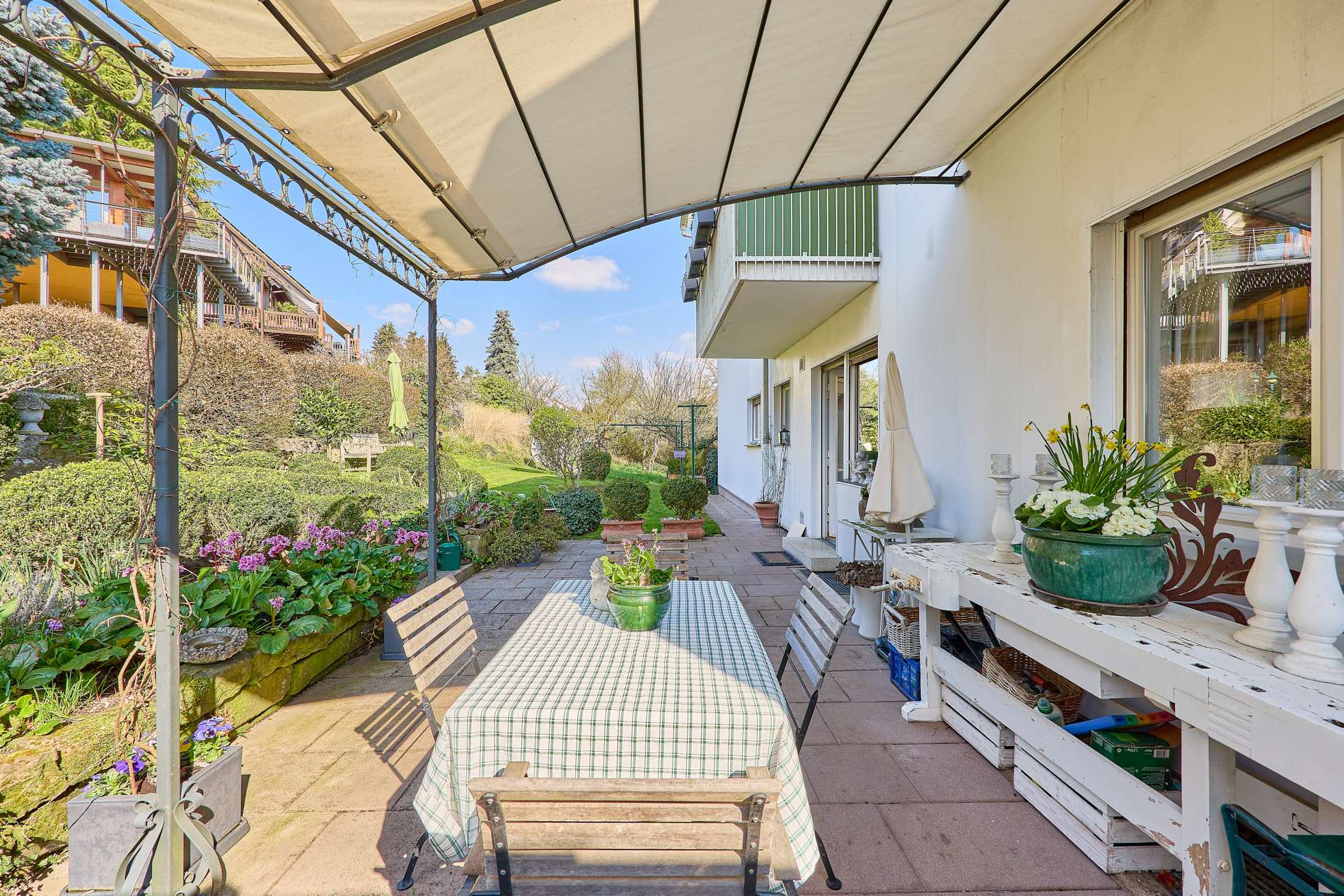 ✓ weitläufiger Garten mit verschiedenen Sitzbereichen für gesellige Zusammenkünfte
